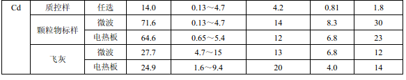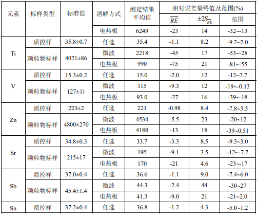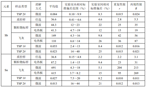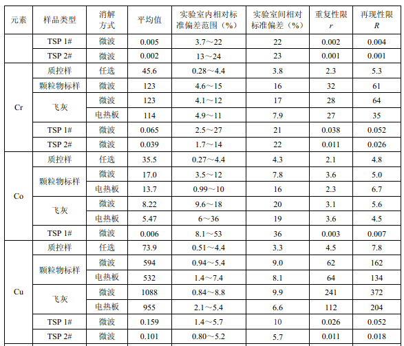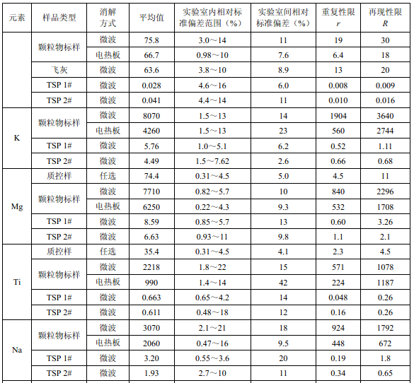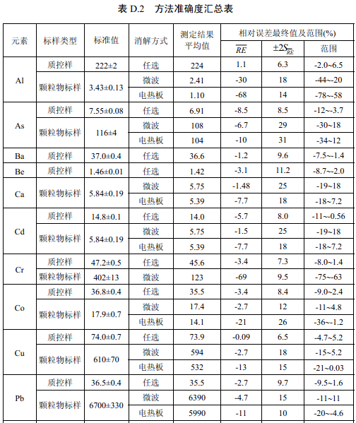 7家實驗室分別對統(tǒng)一提供的大氣顆粒物標樣、濾膜質控樣品、飛灰樣品(廢氣顆粒物模擬樣品)和2 個顆粒物負載量不同的TSP 樣品,同時取6 份平行樣品分別進行微波消解 (7.2.1.1 )和電熱板消解(7.2.1.2 ),用等離子體發(fā)射光譜法測量。對測定結果進行數(shù)理統(tǒng) 計,得到方法的精密度(各元素測定值的實驗室內標準偏差范圍、實驗室間標準偏差、重復 性限和再現(xiàn)性限)和方法的準確度(各元素測定值的相對誤差范圍和相對誤差最終值),詳 見附錄D。