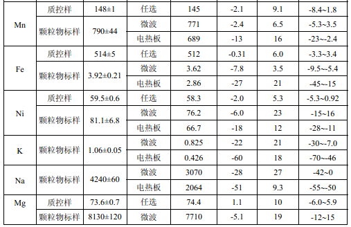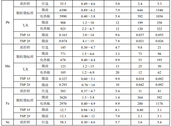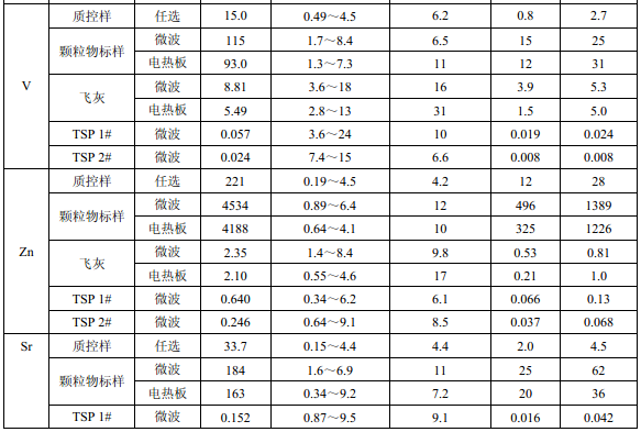濾膜質控樣品由美國職業(yè)健康研究所提供(A-3.1)。顆粒物標樣為美國 NIST(1648a)。 樣品消解處理采用硝酸-鹽酸混合溶液(5.6),定容體積為 50.0 ml。不同類型樣品測定值濃 度(或含量)單位分別為:質控樣(μg )、顆粒物標樣(μg/g)、飛灰樣品(μg/g)和 TSP 樣品(μg/cm 2 )。其中顆粒物標樣中 Al 、Ca、K 元素含量單位為重量百分比(% )。