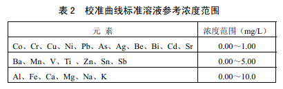 基于顆粒物樣品實際化學組成,表2 給出了標準溶液濃度參考范圍。建議在此范圍內除 標準系列空白溶液(5.9),依次加入多元素標準儲備液(5.13 )配制3 ~5個濃度水平的標準系列。各濃度點用硝酸溶液(5.9)定容至50.0 ml??筛鶕?jù)實際樣品中待測元素濃度情況調 整校準曲線濃度范圍。