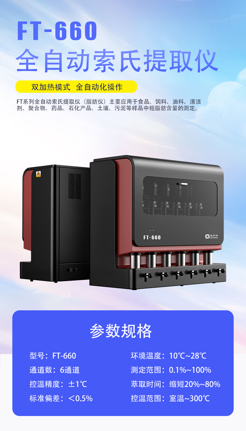 FT-660全自動索氏提取儀(脂肪測定儀)主要應用于食品、飼料、油料、清潔劑、聚合物、藥品、石化產(chǎn)品、土壤、污泥等樣品中粗脂肪含量的測定。