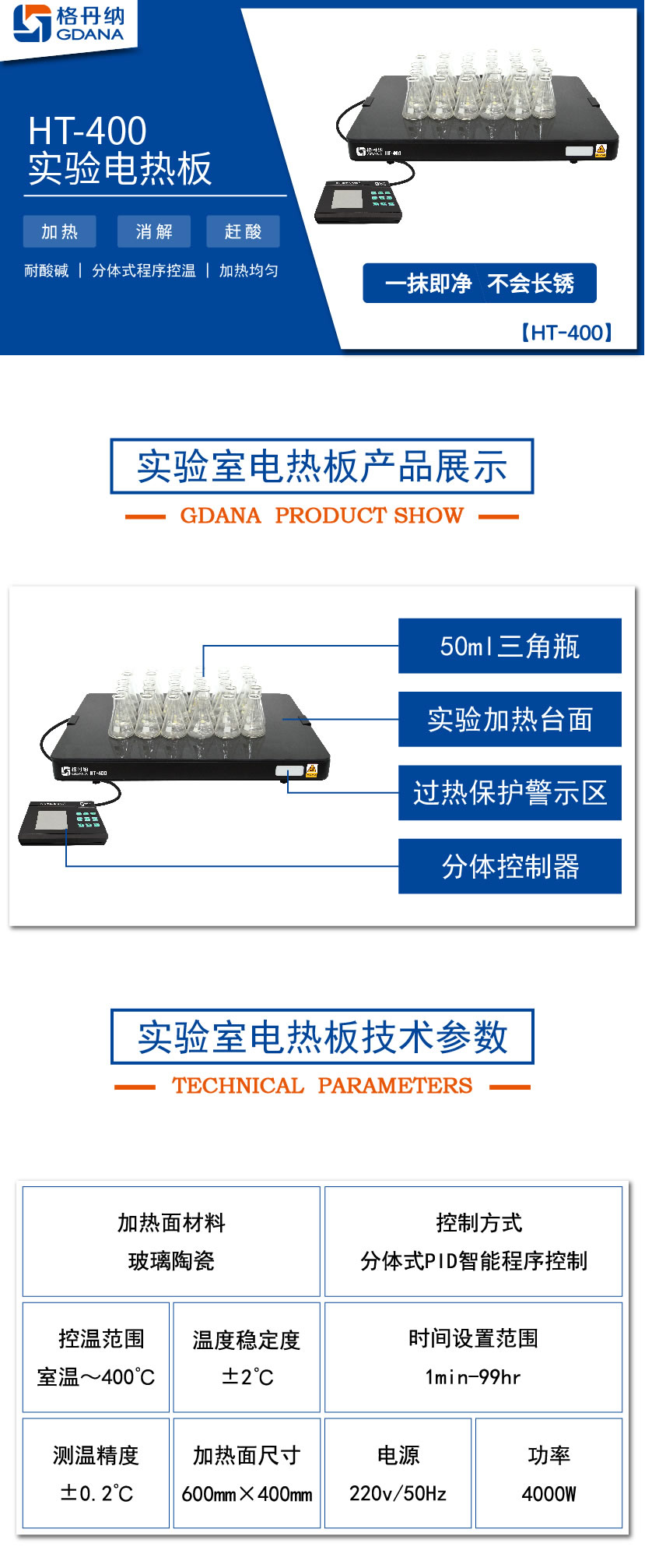 HT-400陶瓷加熱板專用于無(wú)機(jī)化學(xué)元素分析時(shí)對(duì)各類樣品作加熱、消煮、趕酸用的恒溫加熱裝置。臺(tái)面具有耐酸堿,不生銹等特性;分體PID程序數(shù)顯控溫,是實(shí)驗(yàn)室樣品預(yù)處理好助手。