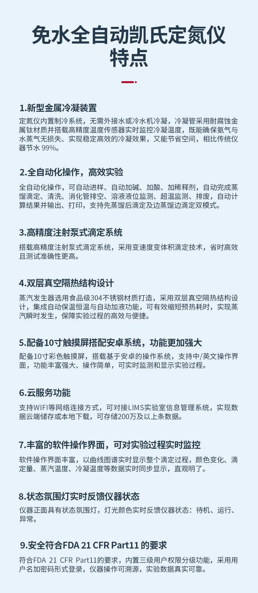 定氮儀內(nèi)置制冷系統(tǒng),無需外接水或冷水機(jī)冷凝,冷凝管采用耐腐蝕金屬鈦材質(zhì)并搭載高精度溫度傳感器實(shí)時(shí)監(jiān)控冷凝溫度,既能確保氨氣與水蒸氣無損失、實(shí)現(xiàn)穩(wěn)定高效的冷凝效果,又能節(jié)省空間,相比傳統(tǒng)儀器節(jié)水 99%。