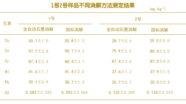 準(zhǔn)確稱取采集的樣品l號(hào)和2號(hào)樣品,分別使用全自動(dòng)石墨消解法和國(guó)標(biāo)推薦法對(duì)樣品進(jìn)行消解處理,每個(gè)樣品每個(gè)方法分別消解6個(gè),統(tǒng)一測(cè)定消解液中6種重金屬元素的含量測(cè)定結(jié)果如下表。由表中可知,全自動(dòng)石墨消解法和國(guó)標(biāo)推薦方法的測(cè)定值基本趨于一致。