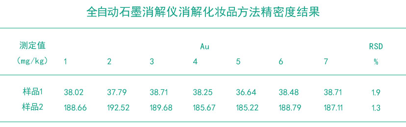 從表中所得出,采用全自動消解儀濕法消解方法測定化妝品中的金含量,多次取樣檢測結(jié)果的相對標準偏差1.9%和1.3%,表明此方法精密度較好,適合實驗要求。