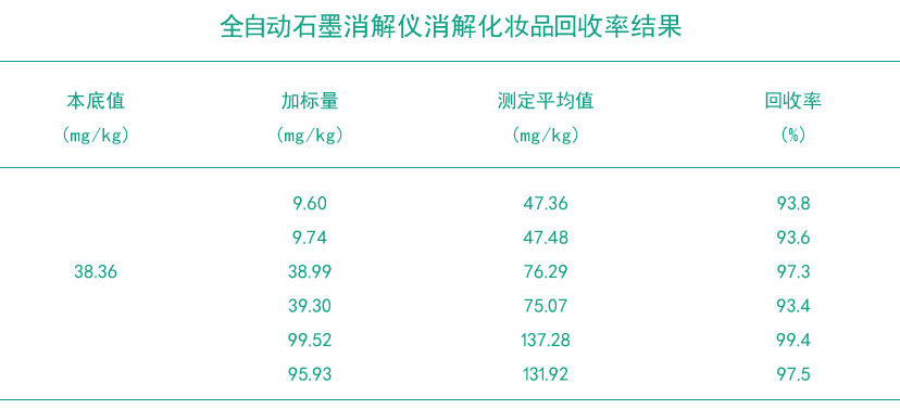 由上表可以得知,不同濃度樣品的加標回收率均在93.4%-99.4%之間。表明此全自動消解儀濕法消解測定化妝品中的金含量準確度較好。