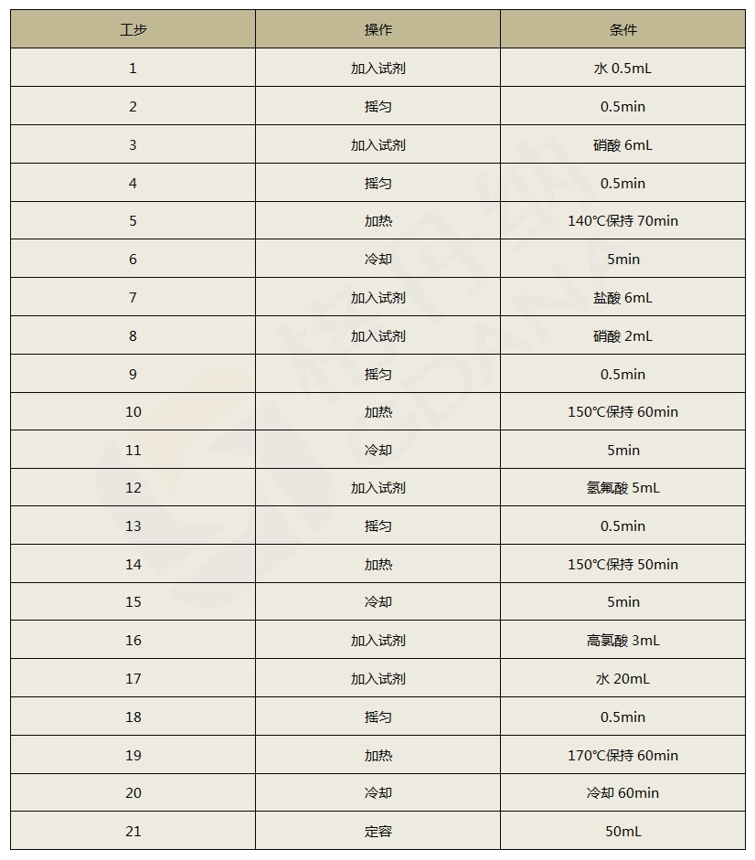 啟動(dòng)全自動(dòng)石墨消解儀,開始加入0.5mL水于樣品中,震蕩搖勻0.5min,加6mL硝酸,震蕩搖勻0.5min,溫度加熱至140℃加熱70min,冷卻5min;加6mL鹽酸和2mL硝酸,震蕩搖勻0.5min,150℃加熱60min,冷卻5min;加5mL氫氟酸,震蕩搖勻0.5min,加熱至150℃加熱50min,冷卻5min;加3mL高氯酸,加20mL水沖洗甭管,震蕩搖勻0.5min,再加熱至170℃加熱60min,冷卻60min,定容至50mL。同時(shí)做空白樣實(shí)驗(yàn)。