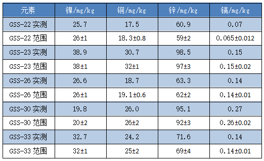 實(shí)驗(yàn)發(fā)現(xiàn)除GSS-23的銅元素檢測(cè)值略低于不確定度范圍, GSS-30的鋅元素檢測(cè)值略高于不確定度范圍,其余樣品的四類元素檢測(cè)結(jié)果均在標(biāo)準(zhǔn)值不確定度范圍之內(nèi),滿足實(shí)驗(yàn)室土壤檢測(cè)實(shí)驗(yàn)的要求。