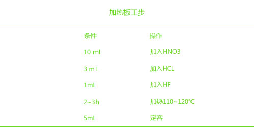 加熱板消解:稱取0.1000g標(biāo)準(zhǔn)土壤樣 品(各3個(gè)平行樣)于洗凈的聚四氟乙烯燒杯中,再加 步驟 入10 mL HNO3、3 mL HCL和 1mL HF,置于加熱 板上保持110~120℃恒溫加熱2~3h,趕酸至近干,用2% HNO3 將消解液定容于5mL,離心,等測(cè);此外在土壤樣品 消解的同時(shí),相同的試驗(yàn)溫度、時(shí)間條件下再做3個(gè)試劑空白,以消除由于試劑帶來的誤差。