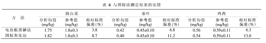 以圓白菜標(biāo)準(zhǔn)物質(zhì)(CBW10014)茶葉標(biāo)準(zhǔn)物質(zhì)(GBW10016)、雞肉標(biāo)準(zhǔn)物質(zhì)(GBW10018)為比對(duì)樣品,設(shè)置5個(gè)平行,用新建預(yù)處理方法與國(guó)家標(biāo)準(zhǔn)中灰化法同時(shí)測(cè)定3種比對(duì)樣品,并對(duì)結(jié)果進(jìn)行比較。