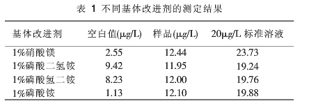 分別選用濃度為5%的硝酸鎂、磷酸二氫銨、磷酸氫二銨、磷酸銨溶液作為基體改進(jìn)劑對(duì)鉻標(biāo)樣及樣品進(jìn)行測(cè)定。具體測(cè)定方法同其他幾項(xiàng)。
