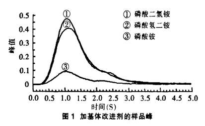 試驗(yàn)分別吸取5mL 5%硝酸鎂、磷酸二氫銨、磷酸氫二銨、磷酸銨作為基體改進(jìn)劑對(duì)鉻標(biāo)樣及樣品進(jìn)行測(cè)定,其基改劑的上機(jī)濃度為1%(體積分?jǐn)?shù))。結(jié)果(表1)表明,硝酸鎂作為基改劑時(shí),標(biāo)樣響應(yīng)值較高,標(biāo)樣與樣品測(cè)量值偏高;而選用磷酸二氫銨、磷酸氫二銨、磷酸銨為基改劑時(shí),響應(yīng)峰峰形好(圖1),測(cè)定結(jié)果沒有差異,回收率也在范圍內(nèi)。但選用的磷酸二氫銨、磷酸氫二銨溶液作空白測(cè) 定時(shí),空白值偏高。因此,選擇5%磷酸銨作為鉻測(cè)定的基體改進(jìn)劑,這與國(guó)標(biāo)法選用的一致。