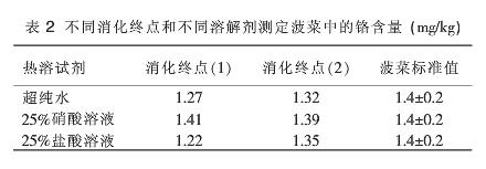以菠菜標(biāo)準(zhǔn)物質(zhì)(GBW 10015)為研究對(duì)象,加入6mL混合酸與電熱板消解。消化終點(diǎn)按以下2種方案進(jìn)行:(1)消化至冒濃白煙,消化液0.5mL左右;(2)消化至近干,沒有流動(dòng)的消化液。取下稍冷,將以上2種不同消化方案得到的消化液分為3個(gè)試驗(yàn)組。各試驗(yàn)組分別加入1mL超純水、1mL 25%硝酸溶液、1mL 25%鹽酸溶液進(jìn)行熱溶解,超純水定容至25mL,于原子吸收分光光度計(jì)上測(cè)定各樣品中鉻含量,并確定消化終點(diǎn)及助溶劑,進(jìn)而確定預(yù)處理方法。