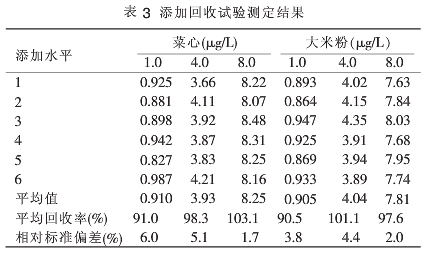 在菜心、大米粉2個(gè)樣品中分別添加水平為1.0、4.0、8.0μgL的標(biāo)準(zhǔn)使用液,試驗(yàn)設(shè)各個(gè)平行,各樣品加標(biāo)回收率和精密度的結(jié)果見表3。結(jié)果表明,本方法測(cè)定兩種樣品,添加回收率高(90%~105%),多次測(cè)定結(jié)果平行性好。