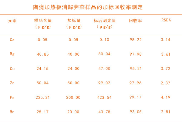 采用陶瓷加熱板消解薺菜測定金屬元素的含量是比較常規(guī)的消解設(shè)備,陶瓷加熱板具有較大加熱臺面,可以進行大批量前處 理,敞開式消解與遠程的控制,實驗安全,操作簡單。玻璃陶瓷臺面一抹即凈,清潔相當方便,濕法消解體系也比較成熟對薺菜的消解效果較好。