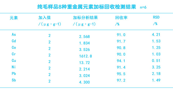 為了驗證實驗結(jié)果的可靠性,在準確測定純毛樣品中8種重金屬元素的基礎(chǔ)上,進行加標回收實驗。實驗檢測結(jié)果如下表: