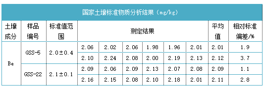 由上表可知對(duì)土壤標(biāo)準(zhǔn)樣品GSS-5和CSS-22的鈹成分進(jìn)行分析,陶瓷電熱板消解法的分析結(jié)果都在標(biāo)準(zhǔn)值范圍內(nèi);陶瓷電熱板消解方法對(duì)兩種不同濃度的土壤實(shí)際樣品中的鈹進(jìn)行消解,分析結(jié)果相對(duì)偏差較低,精密度較好;加標(biāo)回收實(shí)驗(yàn)因電熱板消解的環(huán)境是敞開式的,難免會(huì)受到周圍工作環(huán)境的影響,但總的來說,回收率效果還是不錯(cuò)的,達(dá)到了84~100%,準(zhǔn)確率也高。